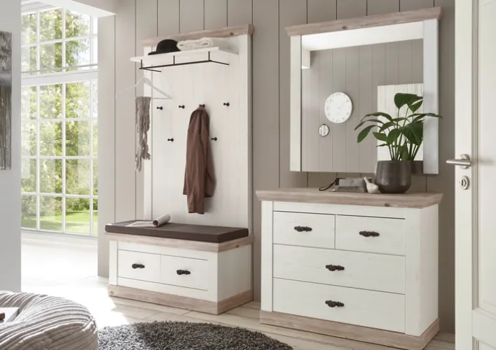 Die Kommode verfügt über vier großzügige Schubkästen, die mit dunkel gehaltenen, dekorativen Griffen ausgestattet sind. Die Oberplatte und der Sockel setzen sich optisch durch eine abgesetzte Pinienholz-Optik ab und runden das Gesamtbild harmonisch ab.