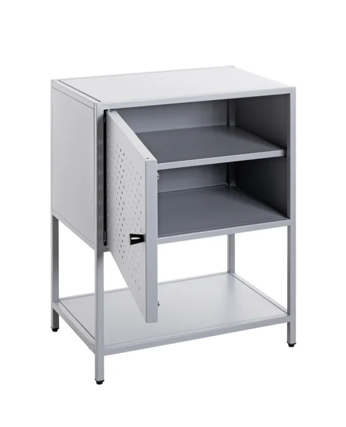 Die Konsole in der Farbe Silbergrau hat einen industriellen Charme und passt in das modern eingerichtete Schlafzimmer. Durch das tolle Design ist die formschöne Konsole mit den Maßen 45 x 30 cm ein Blickfang. Neben einem Polsterbett kommt sie besonders gut zur Geltung und bietet viel Platz und Stauraum. Die Oberplatte und die Ablage sind ideal für Zeitschriften, Wecker und eine Leuchte. Hinter der Drehtür befindet sich zusätzlicher Platz, der mit einem Fachboden unterteilt ist. Die Konsole schafft ein wohnliches Ambiente.