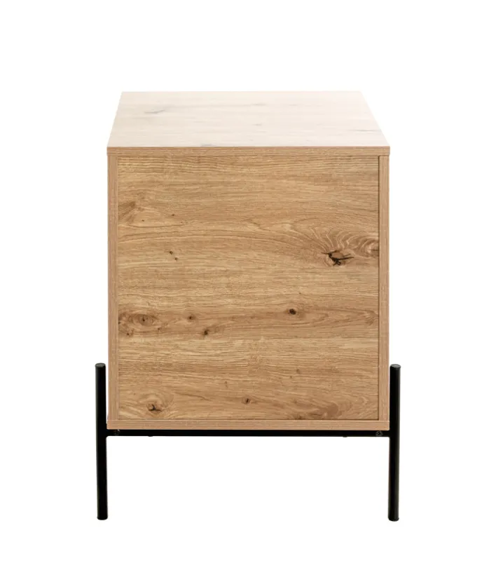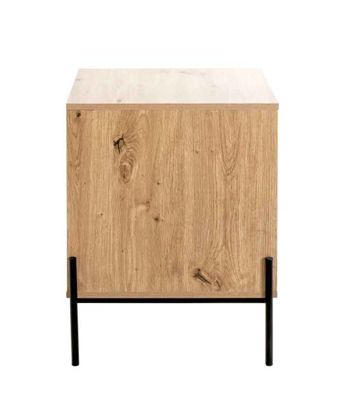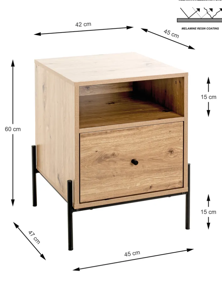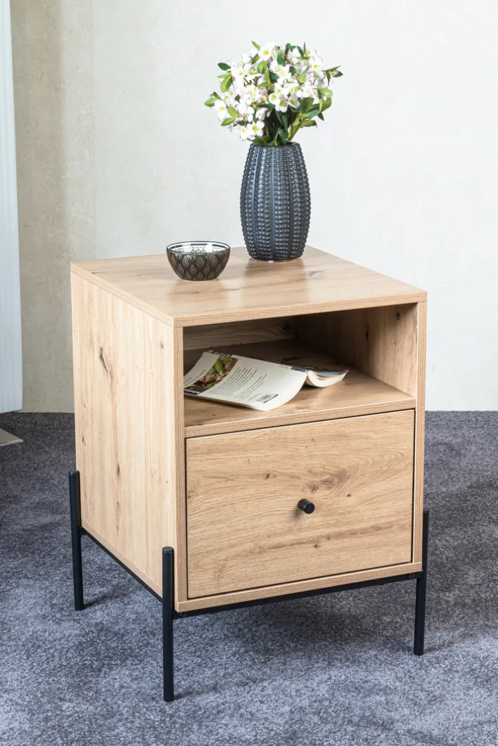 Diese Konsole besteht aus einem melaminharzbeschichteten Eiche-Dekor-Korpus, der von einem pulverbeschichteten Vierfuß-Stahlrohrgestell gehalten wird, das 16 x 16 mm stark ist und über eine Belastbarkeit von 35 kg verfügt. Das Möbel hat eine Ablage, ein offenes Fach sowie einen Softclose-Schubkasten, sodass sowohl Deko-Artikel als auch Dinge, auf die man einen schnellen Zugriff wünscht, auf und in ihm untergebracht werden können. Die Konsole eignet sich somit etwa als Nachtschrank im Schlafzimmer oder als Beistellschrank im Gästezimmer.