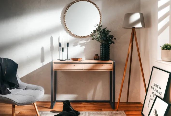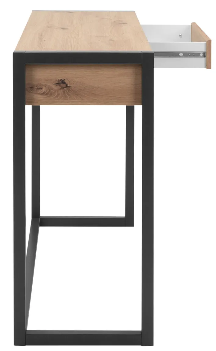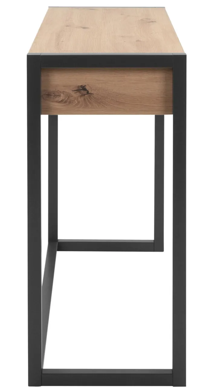Die Konsole DENVER strahlt mit einem luftigen Gestell Leichtigkeit und Eleganz aus. Die Kombination aus den kantigen, anthrazitfarbigen Beinen und dem warmen Holzdekor wirkt wohnlich und gemütlich. Das 100 cm breite und 35 cm tiefe Möbelstück passt gut in eine große Diele, kommt aber auch in Wohn- oder Schlafzimmer gut zur Geltung.