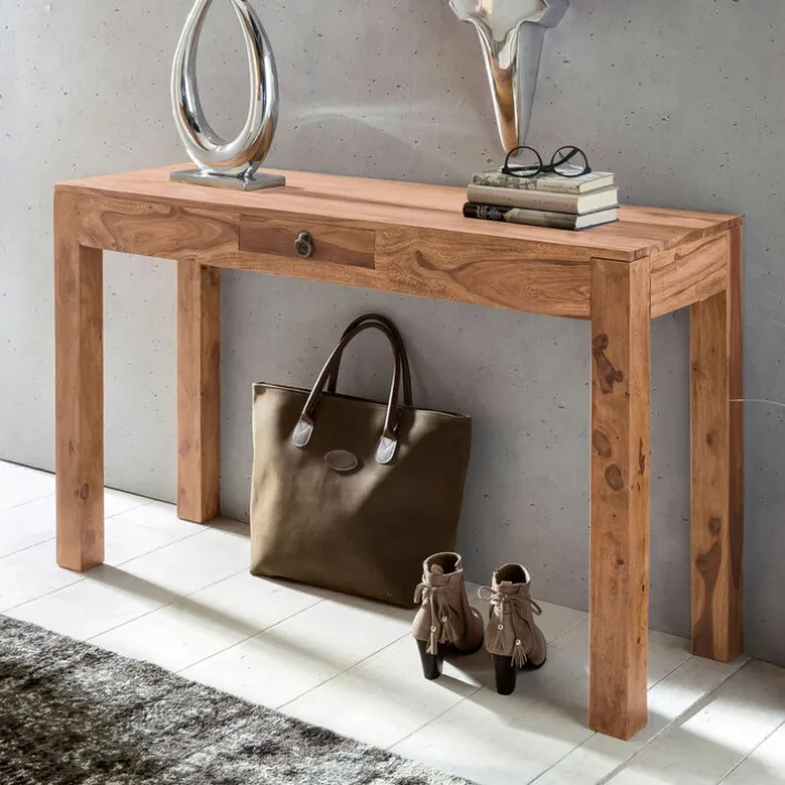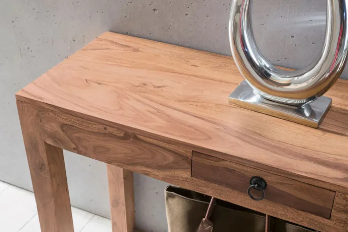 Dieser Konsolentisch besteht aus massivem Holz und hat eine Tiefe von 40 cm. Er besticht äußerlich mit seiner ansprechenden Form sowie seiner schicken Maserung. Praktisch gefällt er dank seiner Stabilität sowie seiner Schublade, die eine Breite von 28 cm sowie eine Höhe von 6 cm aufweist, sodass dort kleinere Dinge problemlos untergebracht werden können. Der Tisch lässt sich mit verschiedenen Deko-Artikeln personalisieren und findet im Wohnzimmer genauso seinen Platz wie im Flur oder dem Gästezimmer.