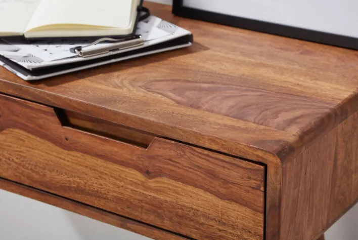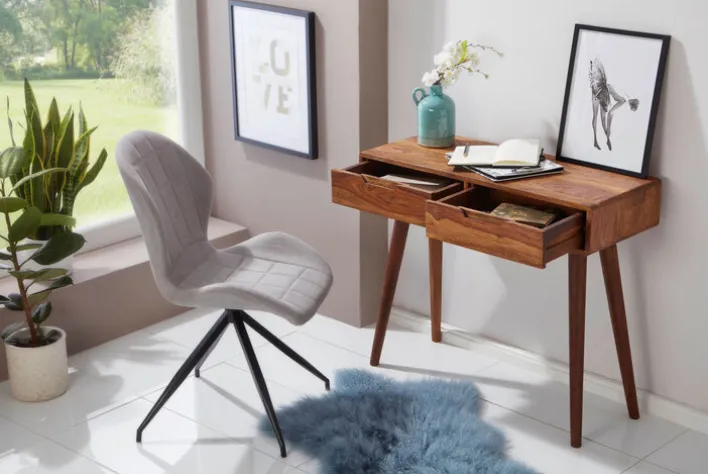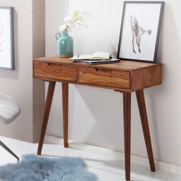 Vor einer hellen Wandfarbe wirkt das kräftige Braun des Konsolentisches besonders attraktiv. Das schicke Möbelstück eigenet sich als Schminktisch, zum Briefe schreiben sowie für ein Hobby wie Zeichnen, Malen oder für diverse andere Aktivitäten. Unter der Tischplatte befinden sich zwei geräumige Schubladen, in denen sich Allerlei unterbringen lässt.