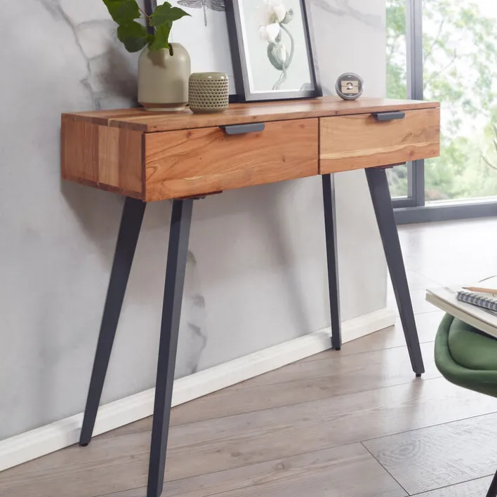 Der rustikal designte Konsolentisch passt mit den Maßen 90 Zentimeter Breite, 36 Zentimeter Tiefe und 78 Zentimeter Höhe an jede Wand im Haus. Das Modell überzeugt in hellen Braun- und Grautönen. Das Akazienholz der Tischplatte und der beiden Schubladen ist abwaschbar gestaltet.