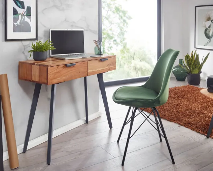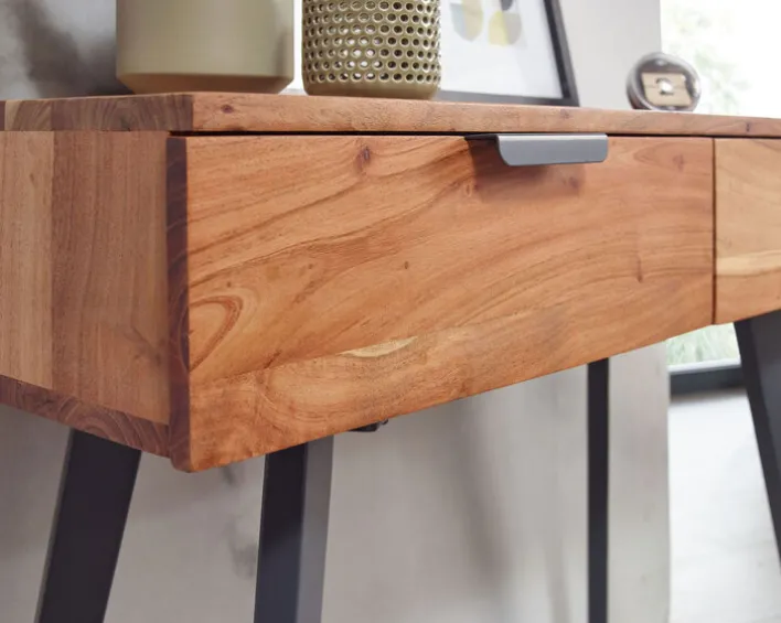 Der praktische schmale Tisch im beliebten Landhaus-Stil bietet Ablage- und Arbeitsfläche sowie relativ viel Stauraum in den Schubkästen. Die vier in der Farbe Schwarz lackierten Tischbeine, die schräg nach außen verlaufen, geben dem Modell eine 50er Jahre Optik. Alle Teile aus Akazienholz sind massiv gearbeitet, sodass das nur 20 Kilogramm leichte Modell mit bis zu 50 Kilogramm belastbar ist.