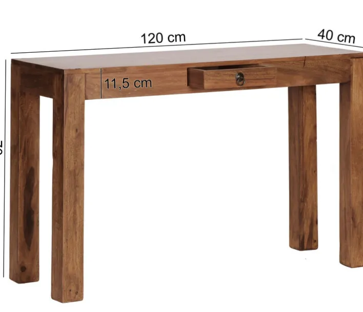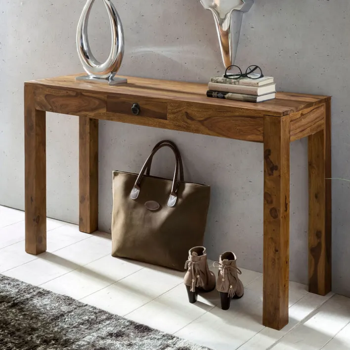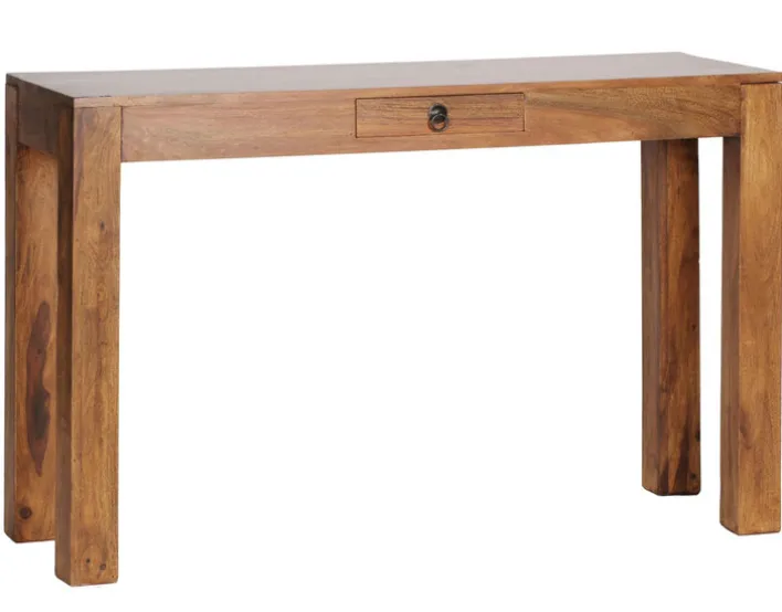 Der Konsolentisch MUMBAI ist aus massivem Sheesham Holz gefertigt, was ihn besonders dekorativ aussehen lässt. Er hat eine Größe von 120 x 40 cm und verfügt über eine Schublade.