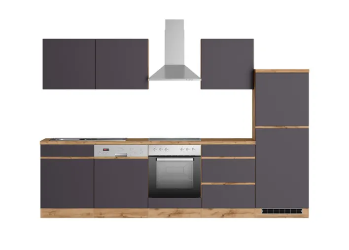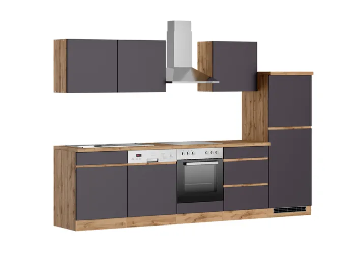 Die Küchenzeile AALBORG wird mit einer Länge von 300 cm und inklusive aller Elektrogeräte geliefert. Neben dem Elektroherd in Kombination mit einem Kochfeld und einer Kühl-Gefrierkombination gehören auch ein Geschirrspüler und eine Luftfilterhaube zur Ausstattung. Korpus und Sockel sind mit einem Wotan Eiche Dekor versehen, ebenfalls die CPL-beschichtete, 38 mm dicke Arbeitsplatte. Alle Fronten, einschließlich der von Geschirrspüler und Kühl-Gefrierkombination sind matt-grau beschichtet.