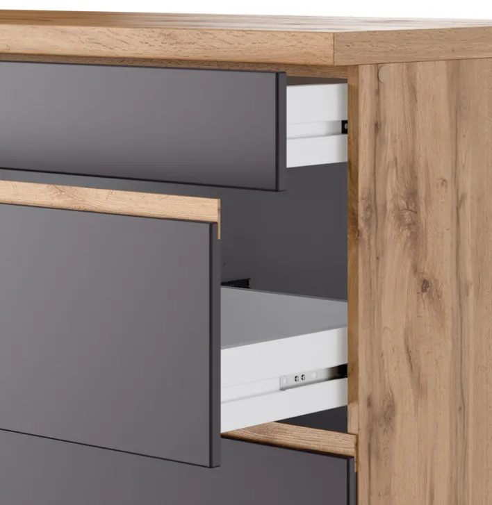 Die Küchenzeile AALBORG wird in Deutschland hergestellt. Durch die Kombination vom attraktiven Eiche Dekor zu den matt-grauem Fronten bietet sich ein interessanter Kontrast. Türen und Kästen besitzen integrierte Griffleisten und mit höhenverstellbaren Füßen lassen sich Bodenunebenheiten perfekt ausgegleichen.