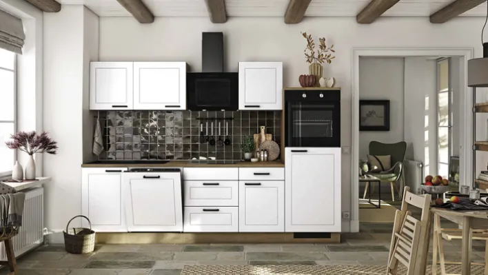 Diese stilvolle Küche im modernen Landhausstil verbindet zeitloses Design mit durchdachter Funktionalität. Die Fronten in elegantem Weiß matt treffen auf einen Korpus in natürlichem Cosmopolitan Eiche Dekor – eine Kombination, die für Wärme und Gemütlichkeit sorgt. Schwarze Metallgriffe setzen dazu einen geschmackvollen Kontrast.