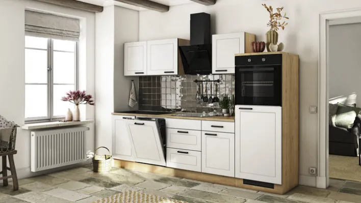 Landhausküche – Weiß matt & Cosmopolitan Eiche – inkl. Elektrogeräte