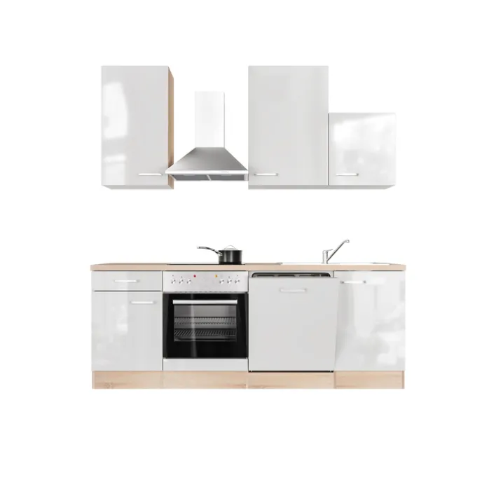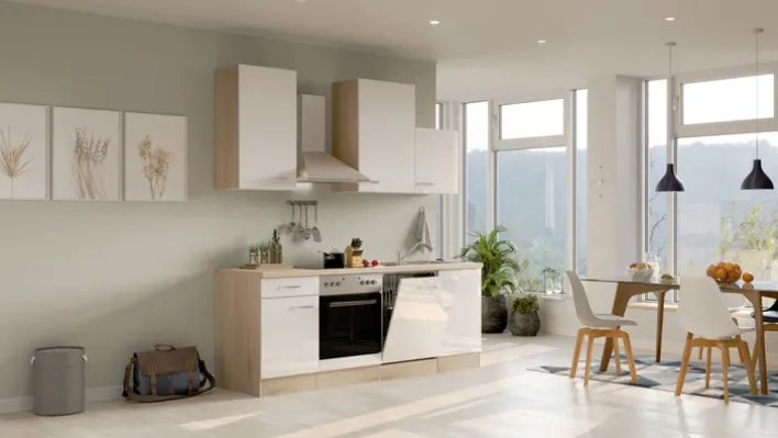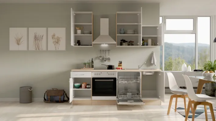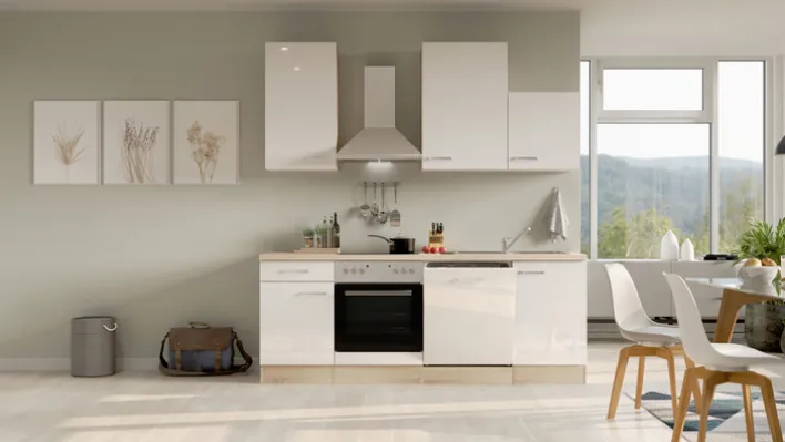 Ausgestattet ist die Küchenzeile mit allen wichtigen Elektrogeräten: Ein Backofen, ein Geschirrspüler und eine Dunstesse sind bereits im Lieferumfang enthalten und machen die Küche sofort einsatzbereit. Durch ihre klaren Linien und die moderne Farbgebung passt die LUKE perfekt in verschiedenste Wohnstile – ob in einer Stadtwohnung, einem Single-Apartment oder als stilvolle Zweitküche.