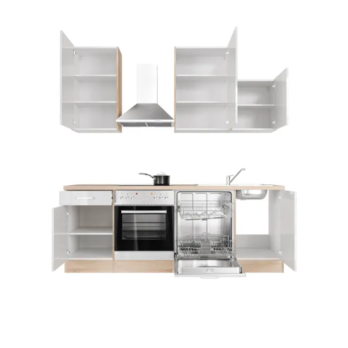 Die Küchenzeile LUKE überzeugt mit einem modernen Design und einer durchdachten Ausstattung auf kompaktem Raum. Mit einem Stellmaß von ca. 220 x 234 x 60 cm bietet sie alles, was man für den täglichen Küchenalltag benötigt. Die eleganten Fronten in Hochglanz Weiß sorgen für eine helle, freundliche Atmosphäre, während der Korpus in Sonoma Eiche Nachbildung einen warmen, natürlichen Akzent setzt und das Gesamtbild harmonisch abrundet.