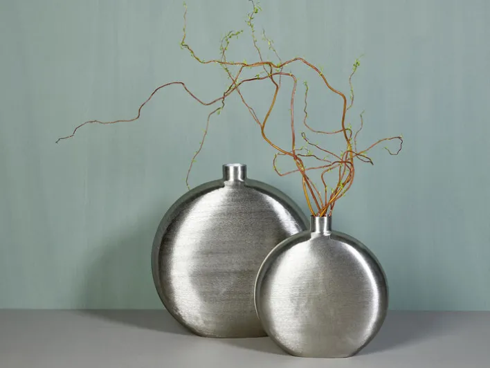 Die bauchige Vase ist aus leichtem Aluminium aufwendig von Hand gefertigt. Die vernickelten Oberflächen des rostfreien Metalls sind durch die aufwendige Bearbeitung mit Schleifpapier schraffiert.