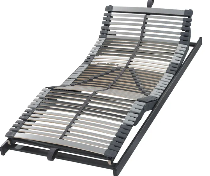 Der Lattenrost TRIO 44 EL bietet eine Liegefläche von 90 x 200 cm und ist speziell für den Einsatz im Schlafzimmer konzipiert. Die motorische Verstellung ermöglicht eine individuelle Anpassung von Kopf- und Fußteil, wodurch verschiedene Liege- und Sitzpositionen eingestellt werden können. Mit einer Höhe von 10 cm und einem Gewicht von 25,80 kg lässt sich der Lattenrost in viele gängige Bettrahmen integrieren. Die Rahmenkonstruktion sowie die 44 flexiblen Federleisten bestehen aus Holz beziehungsweise Holznachbildung und sorgen für eine stabile und langlebige Basis. Die sichtbare Farbgebung ist einheitlich in Grau gehalten, einschließlich der seitlichen Rahmen und der Leistenhalter, was dem Produkt ein dezentes und modernes Erscheinungsbild verleiht. Die Oberfläche der Leisten zeigt eine glatte Textur, während die Lattenenden durch Kunststoffkappen geschützt sind, die sich farblich absetzen. Die insgesamt 44 Latten sind gleichmäßig verteilt und mit einer Mittelzone verstärkt, um die Unterstützung im Rückenbereich gezielt zu erhöhen. Die klare Linienführung und das funktionale Design unterstreichen die praktische Ausrichtung dieses Lattenrosts.