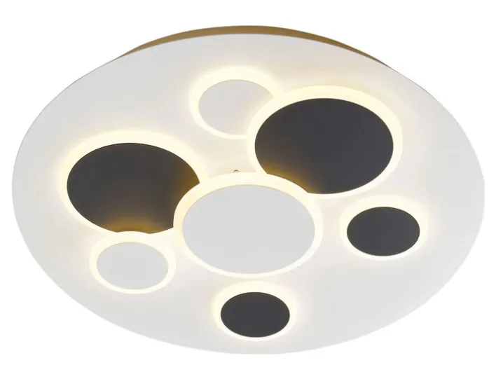Die LED-Deckenlampe aus der Serie NEW STEP vereint modernes Design mit hoher Funktionalität. Mit einem Durchmesser von 50 cm und einer Höhe von 7 cm fügt sie sich harmonisch in jeden Raum ein. Die Lampe besteht aus einer Kombination von Kunststoff und Metall, was ihr eine robuste und zugleich elegante Erscheinung verleiht. Die Hauptfarbe Weiß wird durch schwarze Akzente ergänzt, die in einem kreisförmigen Muster angeordnet sind und der Lampe eine besondere visuelle Tiefe verleihen.