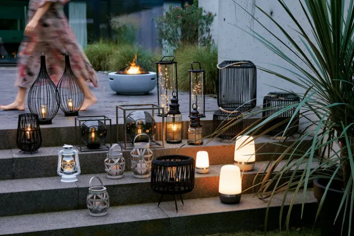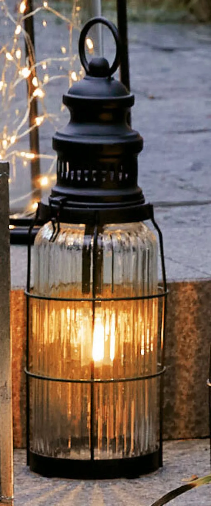 Die Dekoleuchte Laterne VOLTA ist mit einer Höhe von 40 cm eine imposante Beleuchtung für den Outdoorbereich, die Terrasse, Balkon und Garten in ein sanftes Licht taucht.
