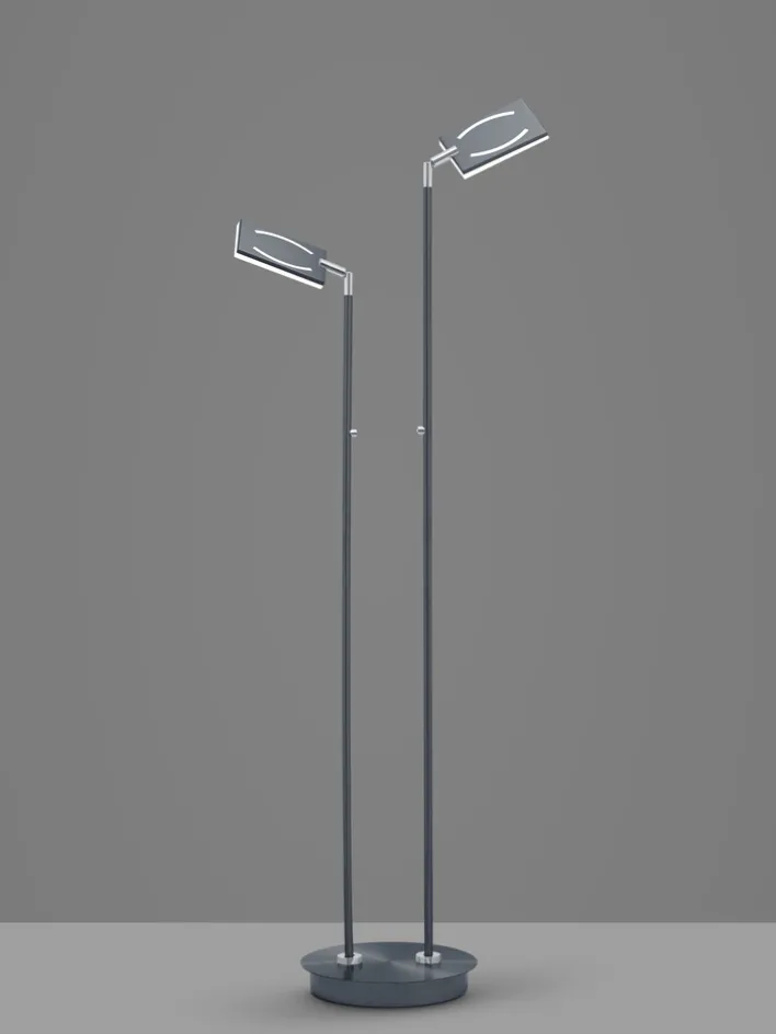 Die LED-Stehlampe MATEO vereint modernes Design mit hoher Funktionalität. Mit einer Höhe von 142 cm fügt sie sich nahtlos in verschiedene Wohnräume ein. Die Hauptfarbe der Lampe ist Grau, ergänzt durch chromfarbene Akzente, die ihr ein elegantes Aussehen verleihen. Die beiden integrierten LED-Brennstellen bieten eine maximale Lichtleistung von 1.360 Lumen bei einem Energieverbrauch von insgesamt 12 Watt. Die Lichtfarbe ist zwischen 3.000 und 6.000 Kelvin einstellbar, was eine flexible Anpassung an unterschiedliche Stimmungen ermöglicht.