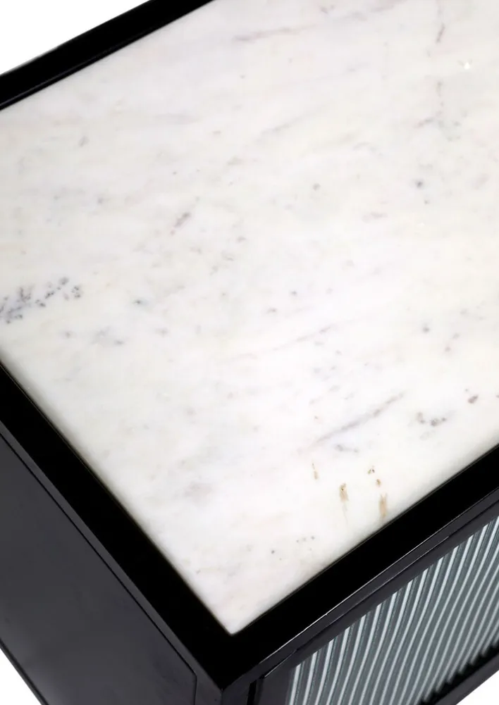 Dieses schicke Lowboard mit einer Tiefe von 43 cm ist ein Blickfang in jedem Wohnzimmer. So ist seine Hauptfarbe Schwarz; diese bildet einen spannenden Kontrast zur weißen Marmorplatte und den goldenen Griffen – welche sich an den beiden Drehtüren befinden. Hinter diesen Drehtüren ist staubgeschützter Stauraum. Darüber hinaus hat die Kommode zwei offene Fächer; diese sind ideal für Dinge, auf die man einen schnellen Zugriff wünscht.