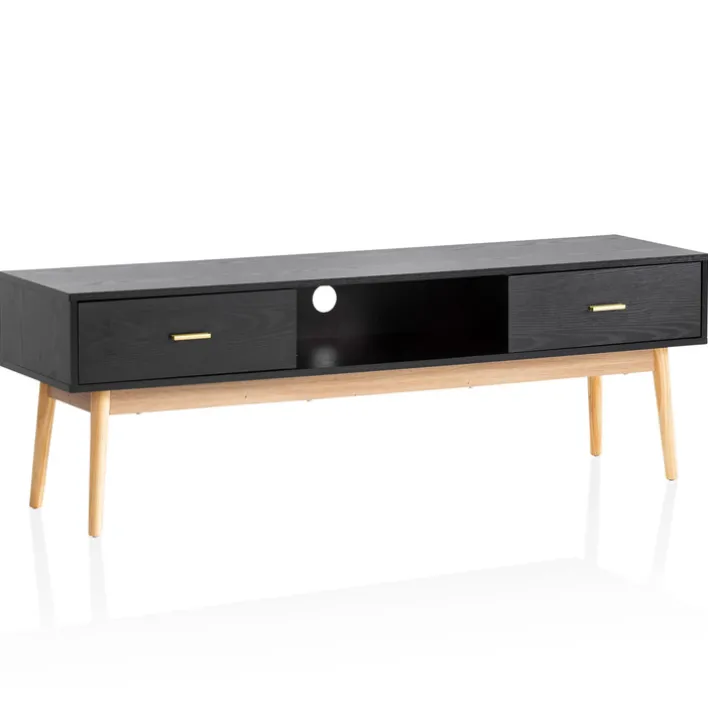 Das schwarz- und braunfarbige Lowboard hat die Maße 150 x 50 cm und präsentiert sich elegant im angesagten Skandi-Stil. Durch das geradlinige Design und die leicht ausgestellten Füße ist das Lowboard ein Blickfang für das modern eingerichtete Wohnzimmer. Zwei Schubkästen und ein offenes Fach mit Kabeldurchlass bieten Platz für verschiedene Accessoires und Unterhaltungselektronik. Die Oberplatte eignet sich für ein großes TV-Gerät. Das Lowboard rundet die Einrichtung ab und schafft ein wohnliches Ambiente.