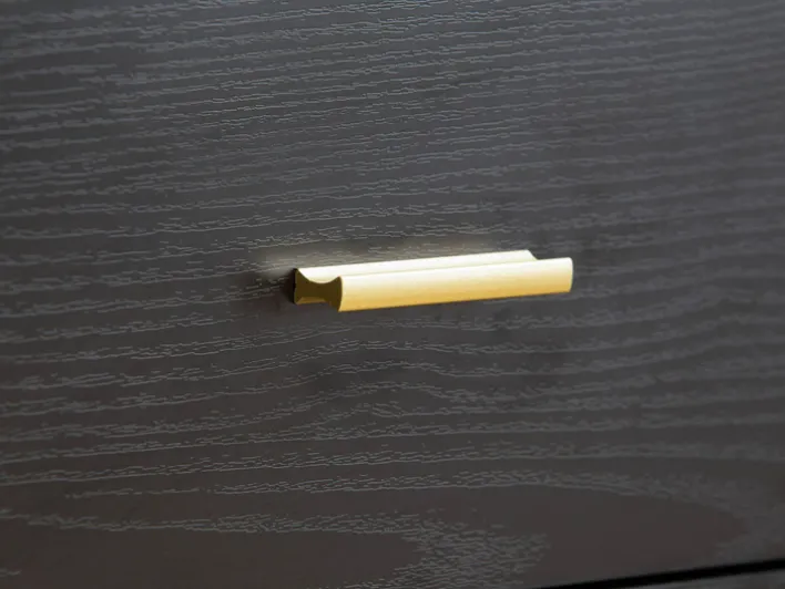 Korpus und Fronten des Lowboards bestehen aus einer Holznachbildung und sind lackiert. Die goldfarbigen Griffe an den Fronten sind aus Metall gefertigt. Die Füße des Lowboards sind aus massivem Eichenholz hergestellt.