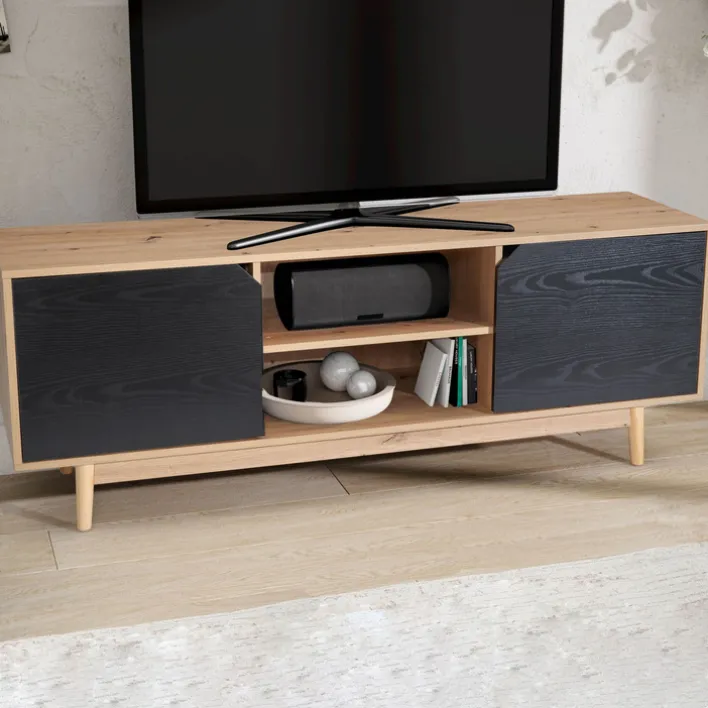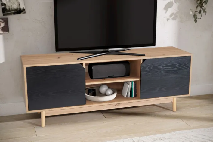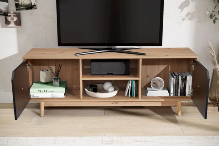 Dieses Lowboard ist für Fernseher aller Größen geeignet. Es hat eine Ausladung von 40 cm und ist bis 28 kg belastbar. Angeboten wird es in einem klassisch, zeitlosen Design. Dieses schafft durch die Holzoptik (Eiche) eine gemütliche Wohnzimmeratmosphäre. Der Korpus ist aus Spanplatte hergestellt und zum Oberflächenschutz foliert. Hinter den beiden Drehtüren befinden sich rechts und längs geräumige Ablagen für Bücher, DVDs und Co. Die beiden mittigen Fächer sind offen. Hier lassen sich Konsolen, TV-Boxen und Lautsprecher-Einheiten unterbringen. Die Kabeldurchführung an der Rückseite vereinfacht die Installation.