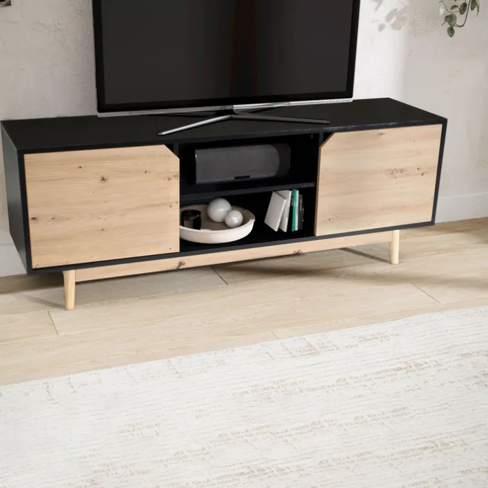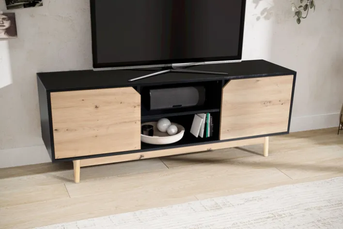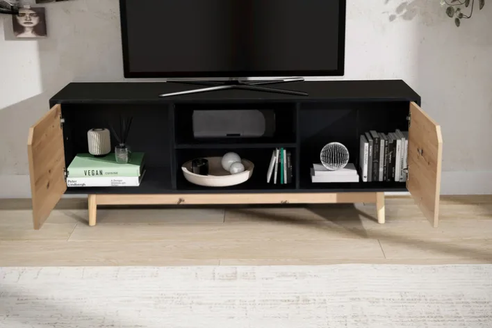 Das 150 x 55 cm große Lowboard in Schwarz und Eiche-Dekor spielt auf geschickte Weise mit Kontrasten: Immer wieder wechseln sich an der Front helle mit dunklen Elementen ab, um so eine dynamische Formsprache zu kreieren. Das Spiel mit den Kontrasten wird auch an den Standbeinen unter dem Korpus fortgesetzt, insbesondere die horizontale Stützfläche sticht optisch hervor.