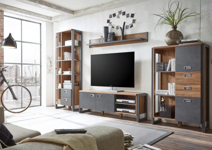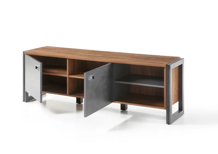 Das modern gestaltete Lowboard DETROIT in den Farben Braun und Anthrazit bietet mit seinen Maßen von 156 x 53 cm ausreichend Platz für Fernseher und anderes technisches Equipment. Das im Industrial-Stil gefertigte Lowboard aus stabiler Holznachbildung wirkt nicht nur zeitlos elegant, sondern bietet zudem viel Stauraum.