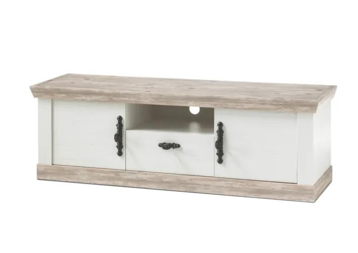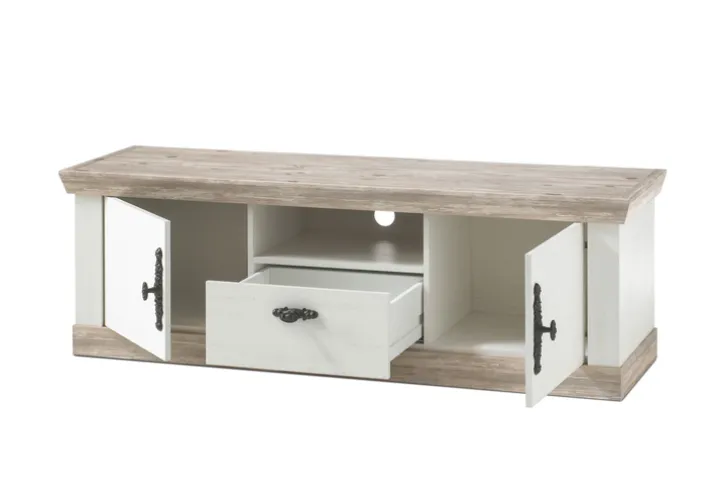 Das Lowboard FLORENZ 156 x 51 cm weiß/braun mit einer Tiefe von 44 cm wirkt mit seinen Applikationen im Pinie-Oslo-Dekor beinahe antik. Es besteht aus einem Schubkasten, einem offenen Fach sowie zwei Drehtüren.