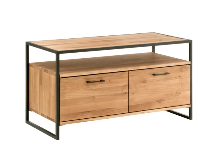 Das Lowboard aus der Serie FRAME vereint Funktionalität und modernes Design im Industrial-Stil. Gefertigt aus massivem Eichenholz und Metall, bietet es eine robuste und langlebige Konstruktion. Die geölte Oberfläche des Holzes verleiht dem Möbelstück eine natürliche Ausstrahlung, während die pulverbeschichteten Metallrahmen für Stabilität sorgen. Mit einer Breite von 115 cm, einer Höhe von 60 cm und einer Tiefe von 52 cm passt es ideal in verschiedene Wohnräume.