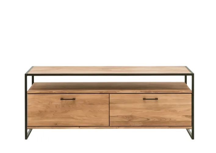 Das Lowboard der Serie FRAME vereint Funktionalität und modernes Design im Industrial-Stil. Mit einer Breite von 155 cm, einer Höhe von 60 cm und einer Tiefe von 52 cm bietet es großzügigen Stauraum. Die Kombination aus massivem Eichenholz und einem pulverbeschichteten Metallrahmen verleiht dem Möbelstück eine robuste und zugleich elegante Optik. Die geölte Oberfläche des Holzes betont die natürliche Maserung und sorgt für eine warme Ausstrahlung.