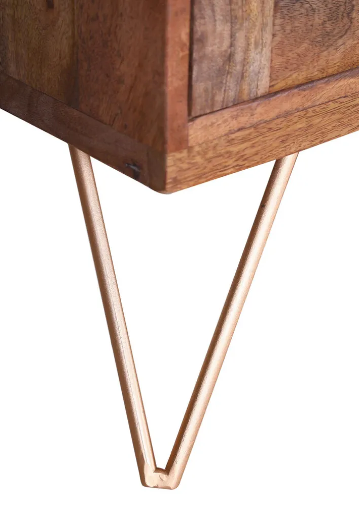 Neben einer Drehtüre mit einem gemusterten Einsatz aus Rattangeflecht gehören zwei Schubkästen. die mit runden Griffen gestaltet sind. zur Ausstattung des Lowboards dazu. In der Mitte verfügt der flache Schrank mit den feinen goldfarbigen Beinen über zwei offene Fächer. Der massive Korpus und die Front sind aus Holz des Mangobaums gearbeitet. Die Oberflächen sind gebeizt und lackiert. sodass sie vor Staub geschützt sind.