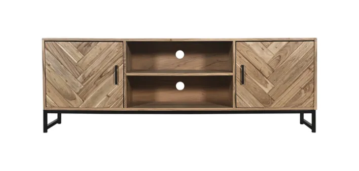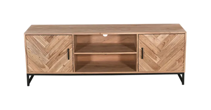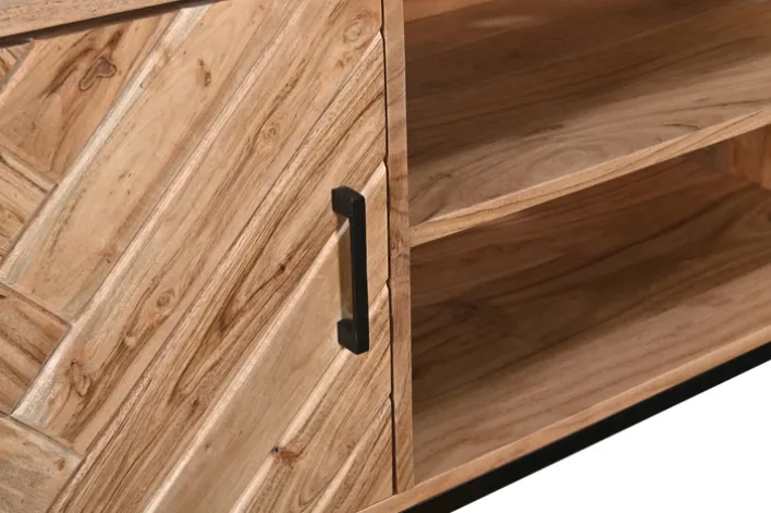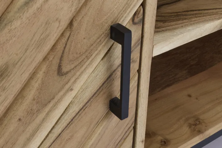 Das LUANDA Lowboard besteht aus robustem Akazie Massivholz und einem Gestell aus schwarzen Metall. Hinter zwei Drehtüren bietet aus ausreichend Stauraum für DVDs und sonstiges Medienzubehör. In den zwei offenen Fächern mit Kabeldurchlass lassen sich Mediengeräte wie DVD-Player und Spielekonsole unterbringen. Darüber hinaus bietet das Lowboard eine geräumige Oberfläche, auf der nicht nur ein Flachbildfernseher, sondern auch Dekorationen ihren Platz finden.