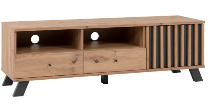 Das Lowboard MEDAN besteht aus hochwertiger Holznachbildung. Mit seiner natürlichen Holzfarbe schenkt es dem Wohnzimmer eine gemütliche Atmosphäre, in der sich Familie und Freunde wohlfühlen. Als Blickfang taugt das TV-Board ebenfalls! Die Absetzungen in Anthrazit verleihen ihm einen stylischen Look. Besonders harmonisch wirkt das Lowboard in Kombination mit weiteren Möbeln der MEDAN Serie. Zu punkten versteht das Möbelstück nicht nur optisch. In zwei Schubkästen und zwei offenen Fächern mit Kabeldurchlass bietet es außerdem Platz für Mediengeräte samt Zubehör.