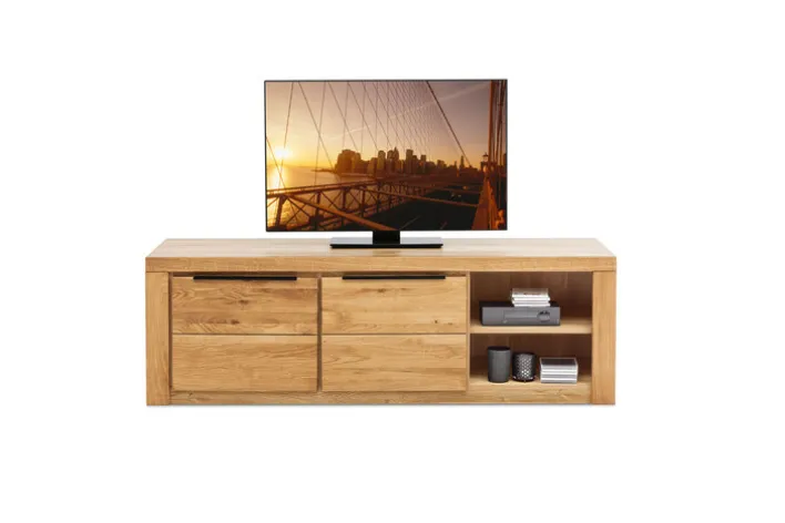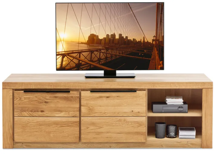 Das Lowboard der Serie SELINA besticht durch sein elegantes Design im Landhausstil. Gefertigt aus teilmassivem Eichenholz, präsentiert es sich in einem warmen, geölten Braunton, der die natürliche Maserung des Holzes hervorhebt. Mit einer Breite von 160 cm, einer Höhe von 51 cm und einer Tiefe von 54 cm bietet es ausreichend Platz für Ihre Wohnaccessoires.