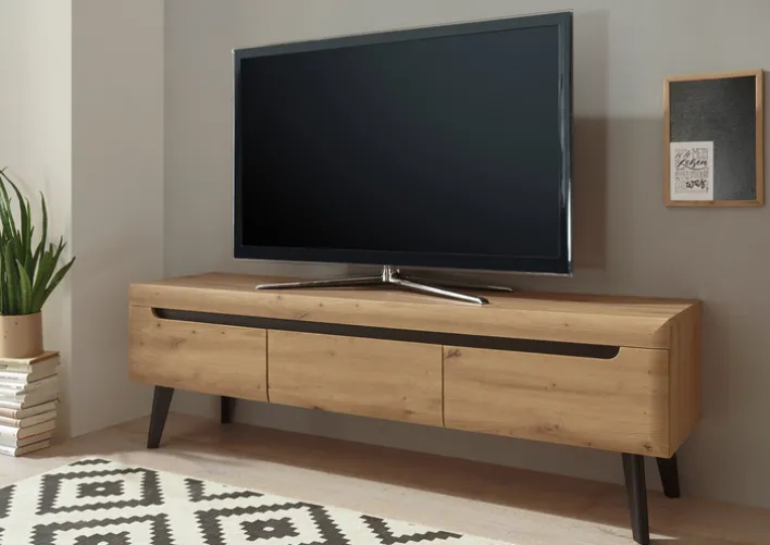 Mit einer Breite von 160 cm, einer Höhe von 50 cm und einer Tiefe von 40 cm bietet es ausreichend Platz für Ihre Mediengeräte und Dekorationen. Die grifflosen Schubkästen, insgesamt drei an der Zahl, sorgen für eine klare und minimalistische Optik. Gefertigt aus mitteldichter Faserplatte (MDF) in Holznachbildung, präsentiert sich das Lowboard in einem ansprechenden Artisan Eiche Dekor.
