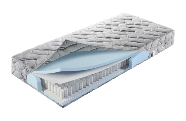 Die Taschenfederkernmatratze der Serie LESBOS bietet eine Liegefläche von 90 x 200 cm und ist ideal für Einzelbetten geeignet. Mit einem Härtegrad von 3 sorgt sie für eine feste Unterstützung und ist besonders für Personen geeignet, die eine stabilere Schlafunterlage bevorzugen. Die Matratze verfügt über sieben Zonen, die eine optimale Anpassung an den Körper gewährleisten und so den Schlafkomfort erhöhen. Das Design der Matratze ist in einem schlichten Weiß gehalten, das sich nahtlos in jedes Schlafzimmer einfügt. Der Bezug aus Textil ist mit einem Reißverschluss versehen, was die Pflege und Reinigung erleichtert. Der Aufbau der Matratze besteht aus einem hochwertigen Taschenfederkern, der für eine gute Belüftung und Langlebigkeit sorgt. Die sichtbare Struktur im Bild zeigt eine zusätzliche Schicht, die den Komfort weiter erhöht und Druckstellen reduziert. Mit einem Gewicht von 19 kg ist die Matratze stabil und dennoch handlich genug, um sie leicht zu bewegen.