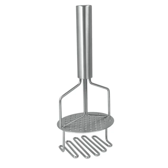 Der metaltex Kartoffelstampfer IMPERIAL ist aus silberfarbigem Edelstahl hergestellt. Er besitzt einen stabilen Griff und ist mit einer Feder sowie einer Lochplatte ausgestattet.