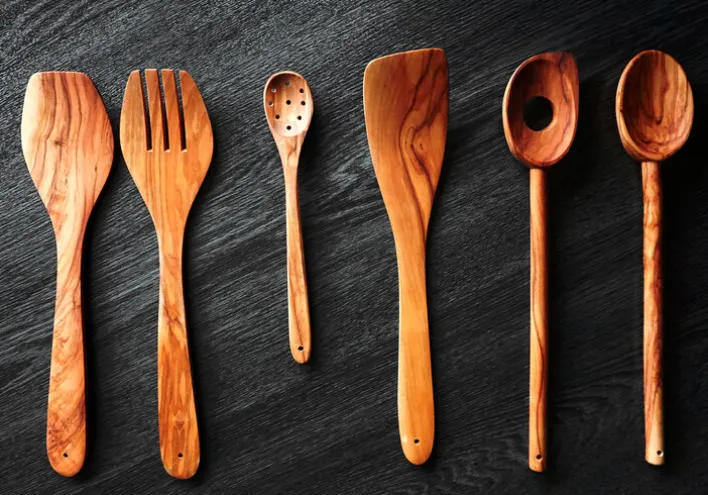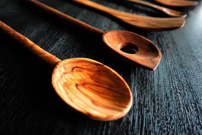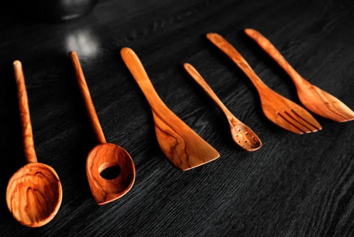 Der elegant gestaltete Pfannenwender ist aus hartem Olivenholz gefertigt. Das verwendete Holz ist unbehandelt, hat glatt geschliffene Oberflächen und ist dadurch hygienisch und lebensmittelecht. Am Ende des Griffs ist eine kleine Bohrung angebracht, die zum Aufhängen des Pfannenwenders dient.