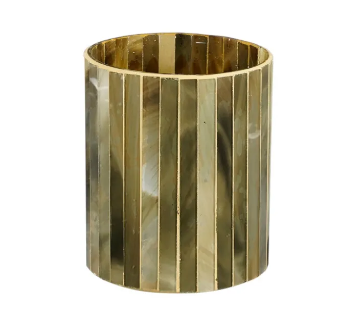 Die auffällige Optik zeigt rechteckige Glasscheiben, die hochkant nebeneinander angebracht sind. Dazwischen befinden sich zarte goldfarbige und sehr dünne Streifen, die das Glas ebenso am oberen und unteren Rand einfassen. Das Grün zeigt ein lebhaftes Design, wodurch das Windlicht an Ausstrahlung gewinnt. Dieses kann in den Wohnräumen aufgestellt werden und darf im Sommer an lauen Abenden mit seinem Licht auf dem Terrassentisch stehen.