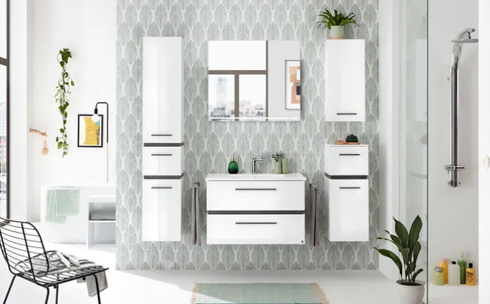Das Highboard besteht aus einer Holznachbildung sowie aus hochwertigem Glas und bietet sich für die Verwendung im Badezimmer an. Es ist mit einem Schubkasten und einer Drehtür ausgestattet. Beide verfügen über einen schmalen, grauen Griff zum Öffnen. Als Aufbewahrungslösung für Handtücher, Putzmittel oder Kosmetikartikel ist das stilvolle Highboard hervorragend geeignet. Dank seiner klaren Formgebung und der schlichten Farben hat es eine minimalistische Ausstrahlung, sodass es sich ganz ausgezeichnet in moderne Badezimmer integrieren lässt. Es passt aber auch gut in klassische Einrichtungen.