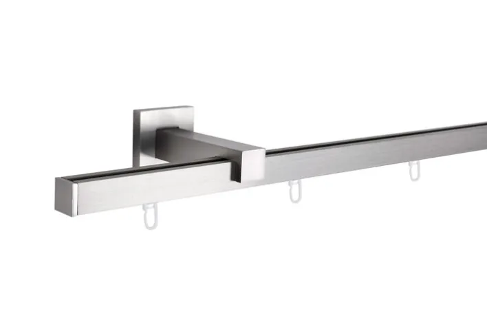 Modernes Wohnen ist schlicht und kommt ohne viel Zierart aus. Das Innenlauf-Komplettset SQUARE fügt sich perfekt ein, denn die aus mattem Aluminium in Edelstahloptik gestaltete Gardinenstange ist glatt und kantig gehalten. Das Material passt sowohl in den Industrial Style als auch in eine moderne Glas-Beton-Metall-Ästhetik. Ob Esszimmer, Wohnraum, Büro oder Jugendzimmer – hier ist einfach alles möglich.