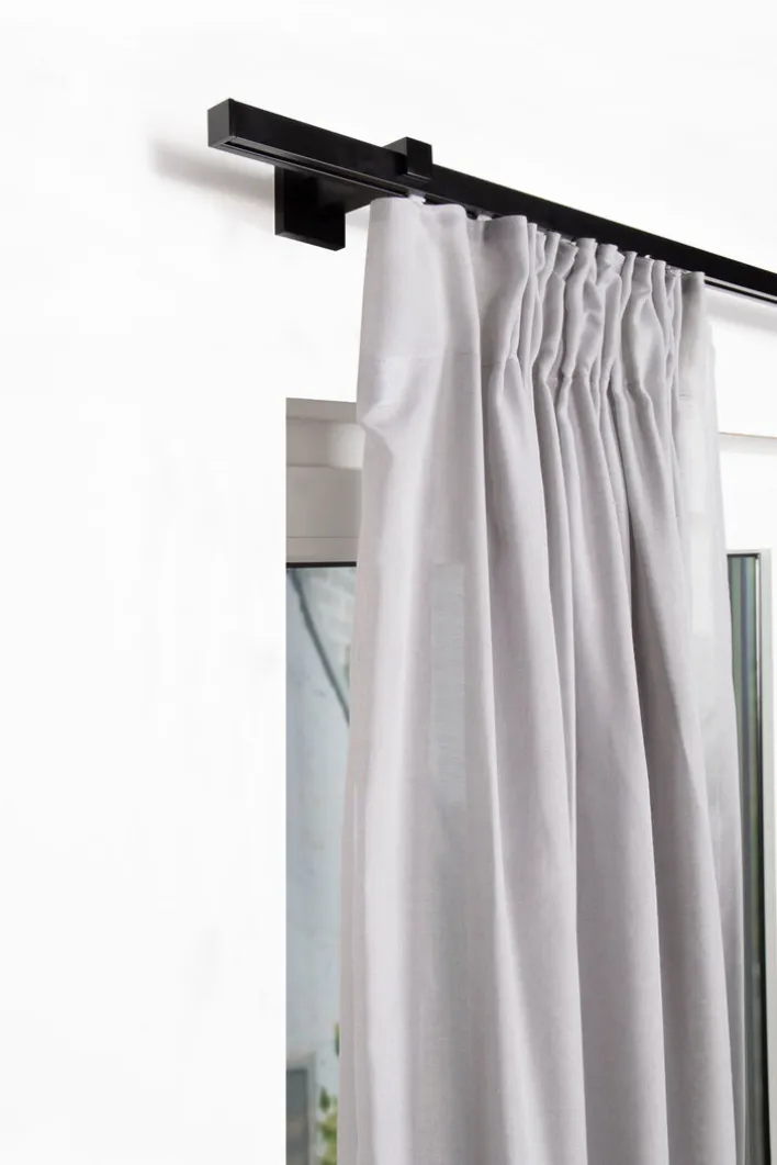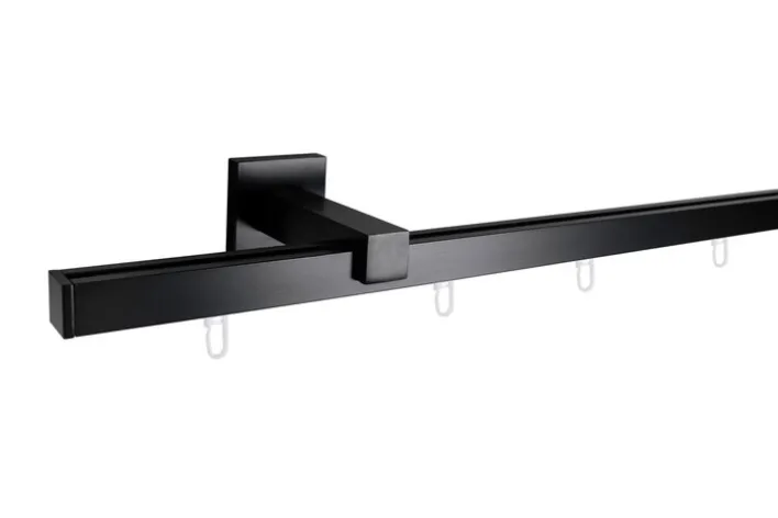 Die schwarzlackierte Innenlauf-Komplettgarnitur, gefertigt aus Aluminium, ist 240 cm lang. Was zur Montage einer modernen Gardinenstange nötig ist, enthält diese Garnitur.