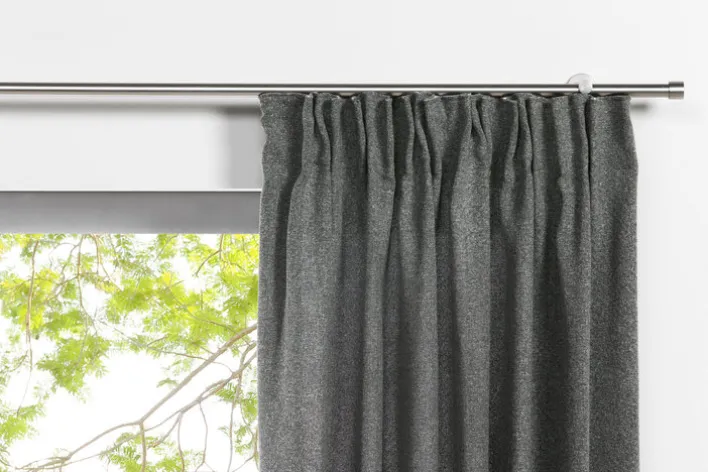 Fenstertraum: Der my deco Schlaufenschal CHALET in Grau weist das großzügige Maß von 135 x 300 cm auf. Er ist aus pflegeleichtem Polyester und lässt sich wahlweise mit Band oder Schlaufen anbringen.