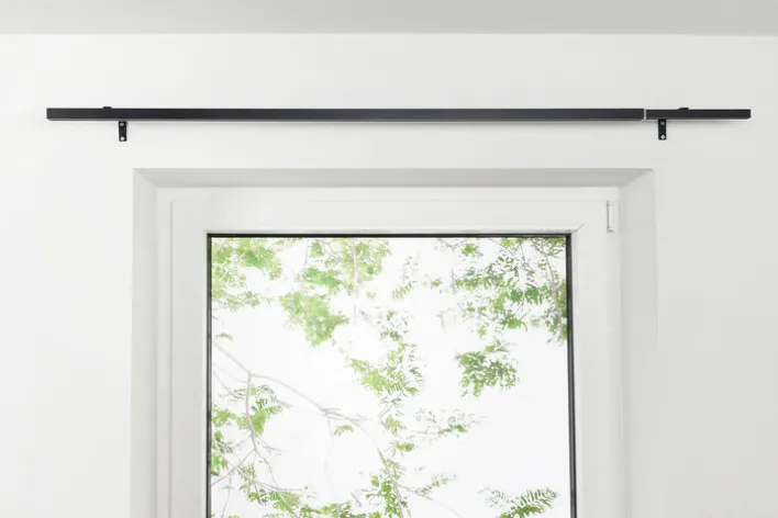 Vorhänge und Gardinen kommen auf der 120 bis 210 Zentimeter langen Stange der schwarzen oder silberfarbigen Teleskopgarnitur ALL IN perfekt in Form. Die Stange ist eckig und kommt ganz ohne Endstücke aus. Der Look ist damit ausgesprochen geradlinig.