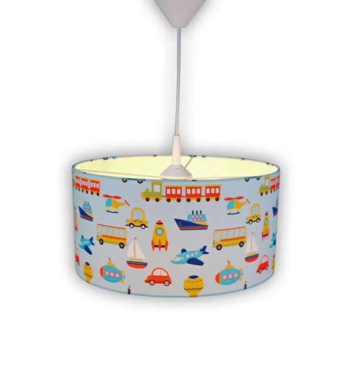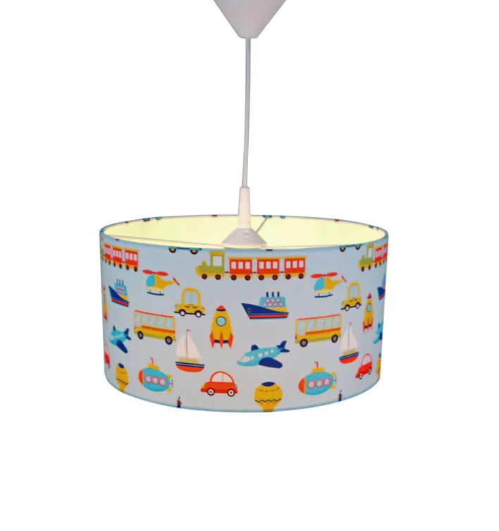 Die Pendellampe mit der AGL/Retrofit Fassung E27 bringt mit einem maximalen Verbrauch von 60 Watt ein warmes, angenehmes Licht ins Kinderzimmer. Passend zu allen hellen und kunterbunten Einrichtungen, ist das ein zeitloser Allrounder. Flugzeuge, Autos, Frachtschiffe, Züge und sogar Heißluftballons und Raketen bringen kleine Technikfans ins Schwärmen. Der Stoffschirm sorgt dafür, dass das Licht nicht blendet und angenehm indirekt im Raum verteilt wird.