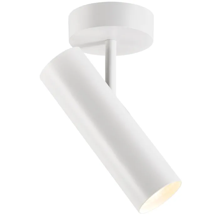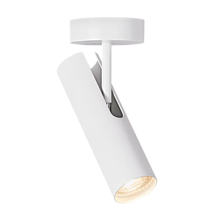 Die LED Deckenleuchte MIB ist aus weißfarbigem Metall gefertigt und kommt mit einem Durchmesser von 6 cm aus. Sie ist mit einem verstellbaren Gelenk ausgestattet. Dadurch lässt sich der Leuchtenkopf individuell ausrichten.