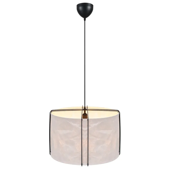 Die Nordlux Retrofit Pendelleuchte CARDINE hat einen Durchmesser von 50 cm. Sie ist insgesamt 53 cm breit und 38 cm hoch. Gefertigt ist sie aus schwarzem Metall, weißem Kunststoff und einem Schirmbezug aus Tyvek.