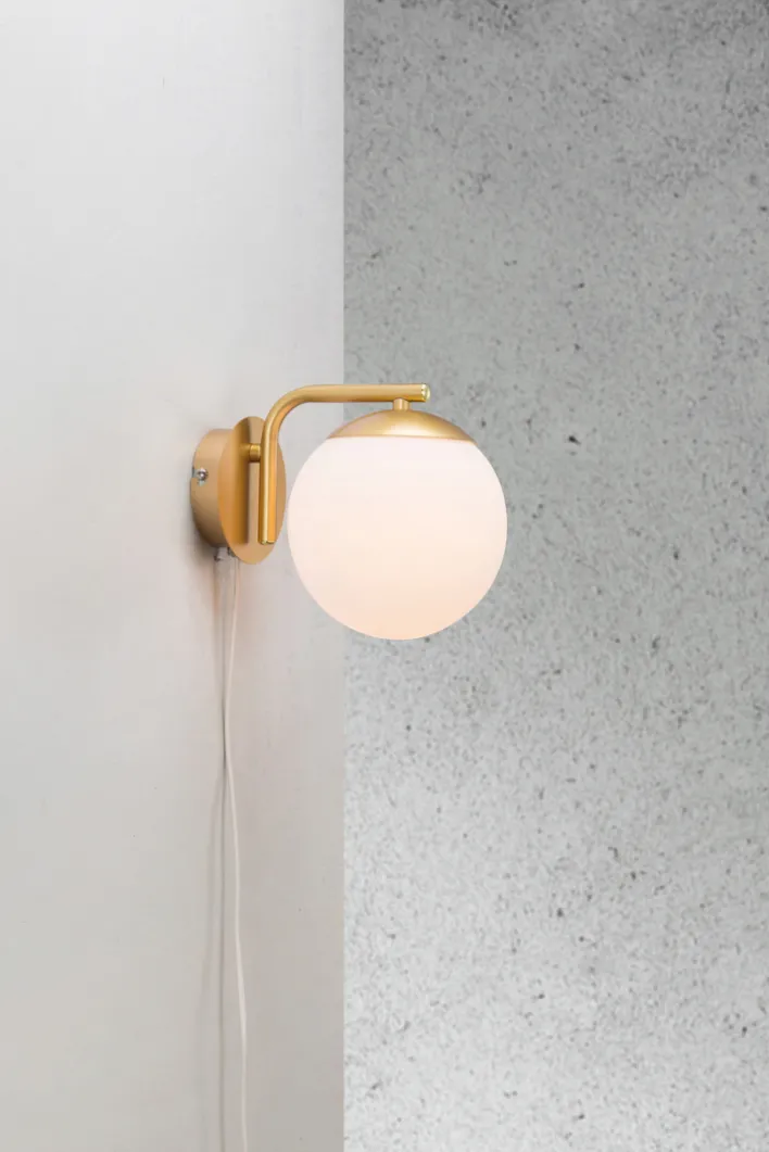 Das Glas der 1-flammigen Retrofit Wandleuchte GRANT ist weißfarbig und ihr Metall messingfarbig. Mit einem Durchmesser von 14,5 cm ist sie ein kompaktes Highlight an jeder Wand.