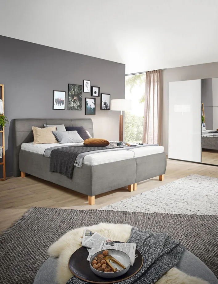 Das elegante Ole Gunderson Polsterbett FENSON BERGEN XXL mit einer komfortablen Liegefläche von 180 x 200 cm ist schnell der neue Mittelpunkt im stilvoll eingerichteten Schlafzimmer. Durch den tollen Bezug im Farbton braungrau, bombierten Seitenteilen und Füßen aus hellem Buchenholz fügt sich das Bett harmonisch in moderne oder klassische Einrichtungen ein. Für angenehme Nächte sorgen zwei stabile Lattenroste und zwei Taschenfederkernmatratzen mit den Härtegraden H2 und H3. Für Kissen und die Bettwäsche ist das Polsterbett mit Bettkästen ausgestattet.