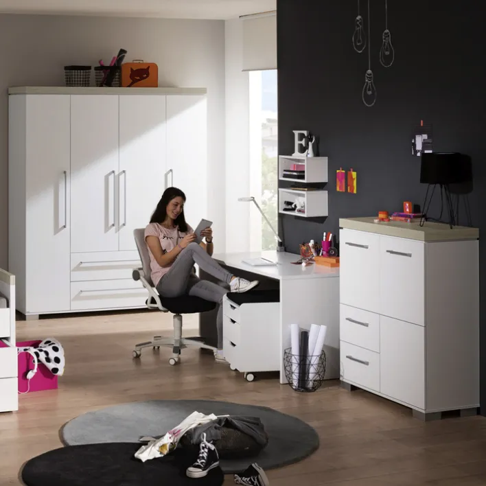 Das Unternehmen PAIDI stellt den Kleiderschrank KIRA in gradlinigem Design aus hochwertigen Materialien her. Er präsentiert seine pflegeleichten Oberflächen im zeitlos attraktiven Farbton Kreideweiß, im oberen Bereich zeigt er eine Absetzung in Holz-Dekorfarbe Eiche. Vier Drehtüren verschließen perfekt ausgestattete Innenräume, die beiden mittigen Türen lassen im unteren Bereich Platz für zwei geräumige Schubkästen. Der Kleiderschrank fungiert mit seinem umfangreichen Platzangebot als Ordnungshüter im Reich des Nachwuchses. Im Onlineshop von porta Möbel finden Sie weiteres Interieur fürs Kinderzimmer vom Hersteller PAIDI.