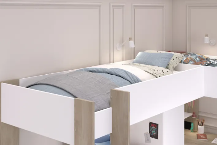 Das Parisot Eck-Hochbett ALEX braun/ weiß bietet zwei über Eck liegende Schlafplätze in der Größe 90 x 200 cm. Die Schenkellängen betragen 295 cm und 231 cm, bei einer Gesamthöhe von 180 cm. Beide Schlafplätze sind über eine Leiter erreichbar, und die erhöhten Bettseitenwände sorgen für zusätzliche Sicherheit während des Schlafs.